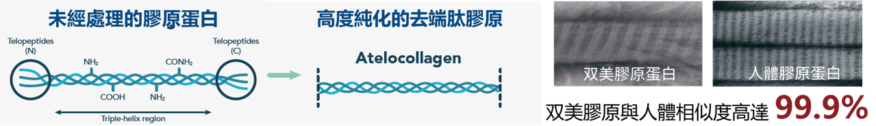 尤其2014年所推出的雙美第三代「膚力原」劑型,更透過3大獨家技術,產製與人體高達 99.9% 相似度的「去端肽膠原蛋白」(Atelocollagen),使其成為目前市面上最接近人類膠原蛋白的產品。